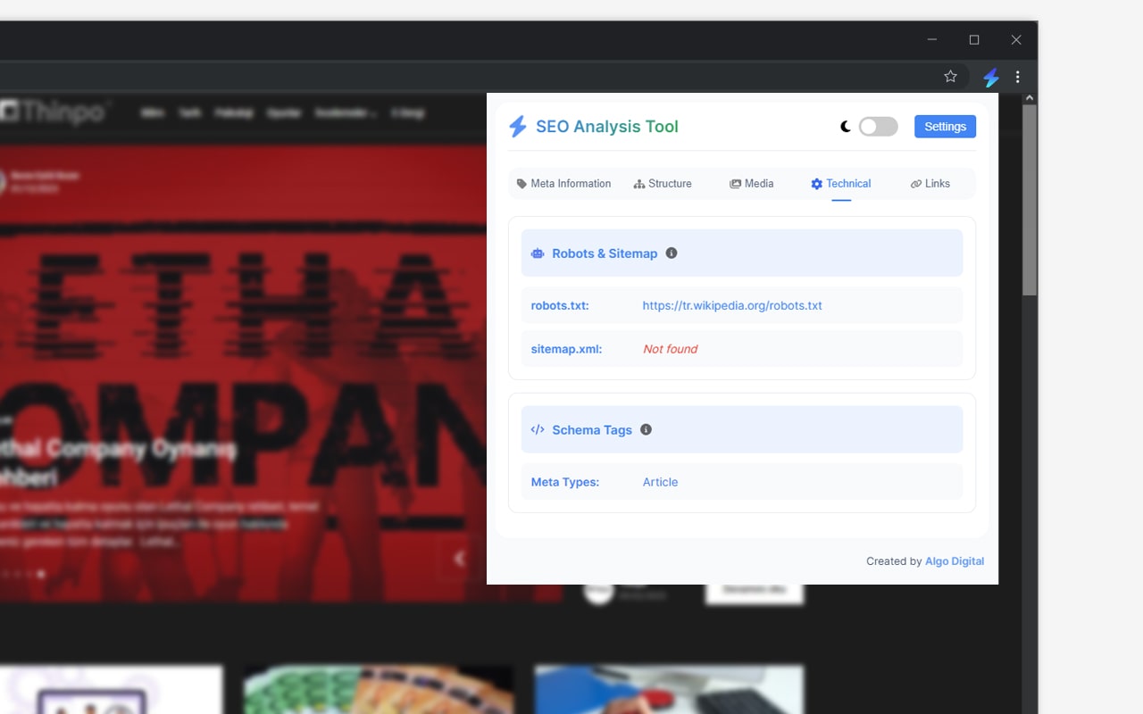 Algo SEO Analysis Tool, tarayıcınıza ekleyebileceğiniz ve dilediğiniz şekilde kullanabileceğiniz en iyi ücretsiz SEO eklentisi olup, tarayıcınız üzerinden hızlıca teknik SEO incelemeleri yapmanıza olanak tanır.